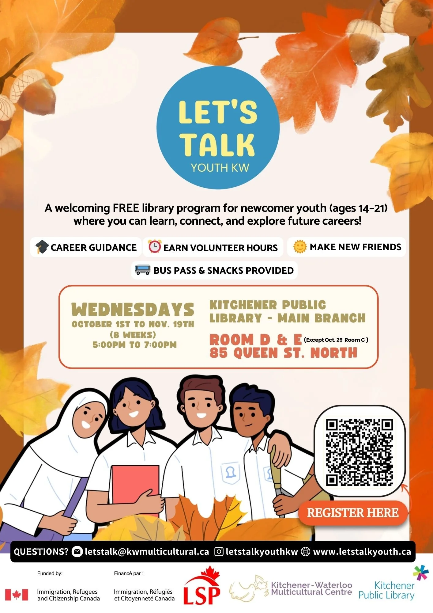 Come and join us in our FREE Program for Newcomer Youth (Ages 14–21) — a welcoming library program where you can learn, connect, and explore future careers!
